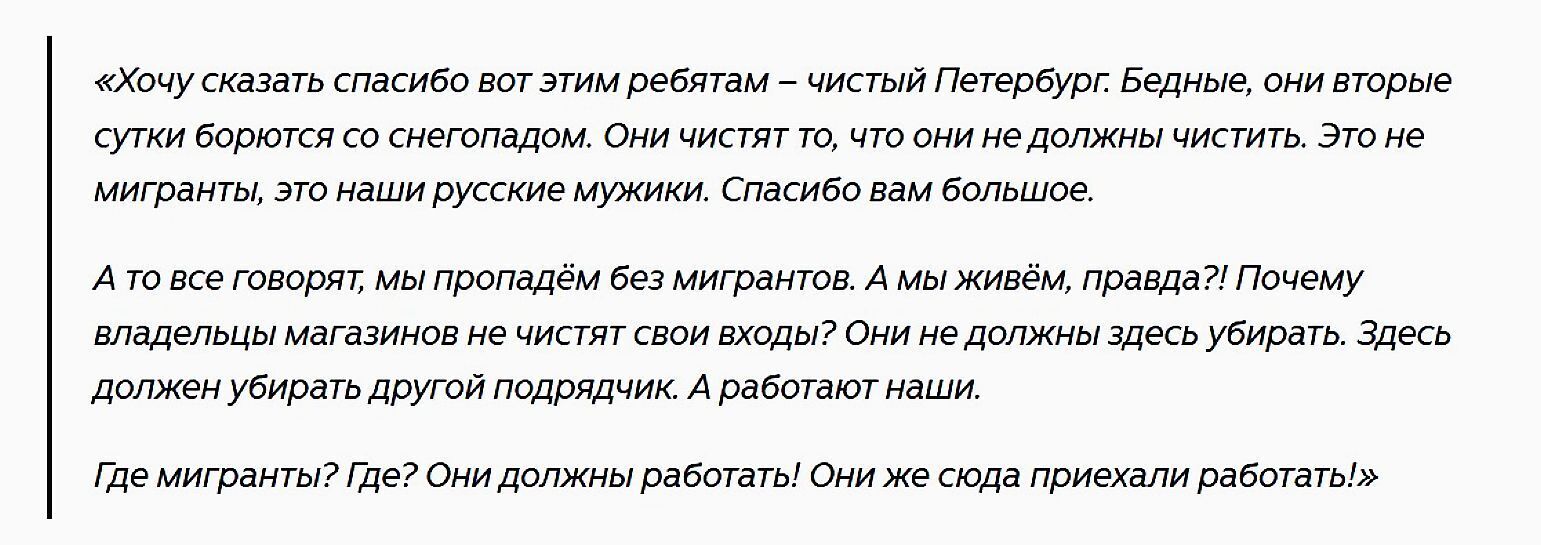Сейчас за копейки работают россияне, а мигранты переходят в привилегированную масть. И кто-то делает на этом огромные деньги. Отдельные, жадные личности прекрасно просматриваются.