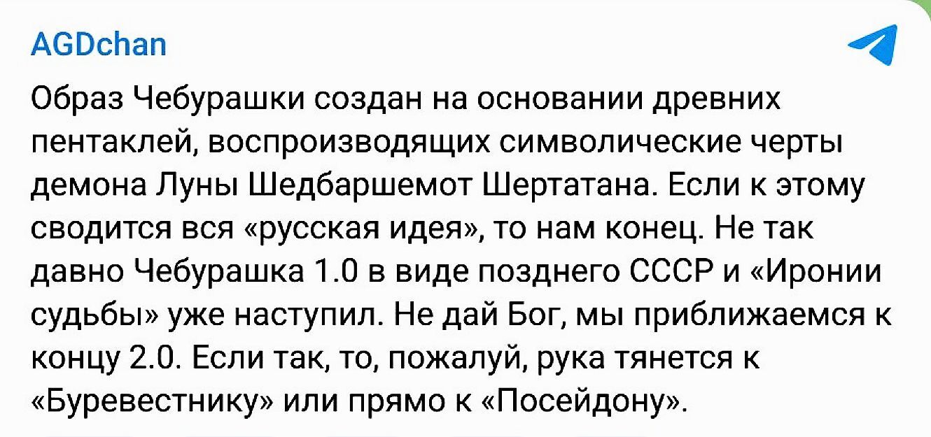 После выхода на экраны страны, ставшего бешено полулярным фильма «Чебурашка 2», философ, созерцатель и аналитик Александр Дугин опубликовал в своём телеграм-канале факты о Чебурашке, которые ещё не были известны никому в мире.