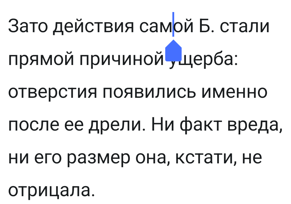 Зато действия самой Б. стали прямой причиной ущерба: отверстия появились именно после ее дрели. Ни факт вреда, ни его размер она, кстати, не отрицала.