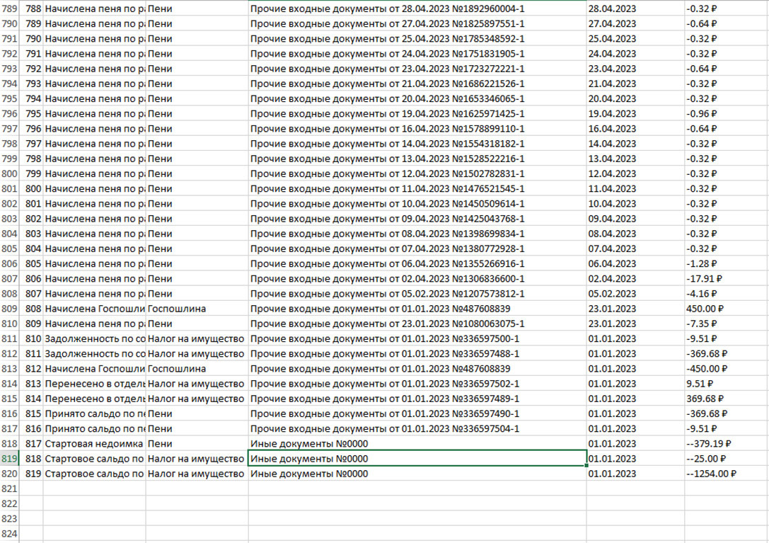 Вдруг в январе 2023-го на основании 3-х иных документов сразу несколько сумм долга — строки 820, 819, 818, это начало, 3 документа с нулевым номером.