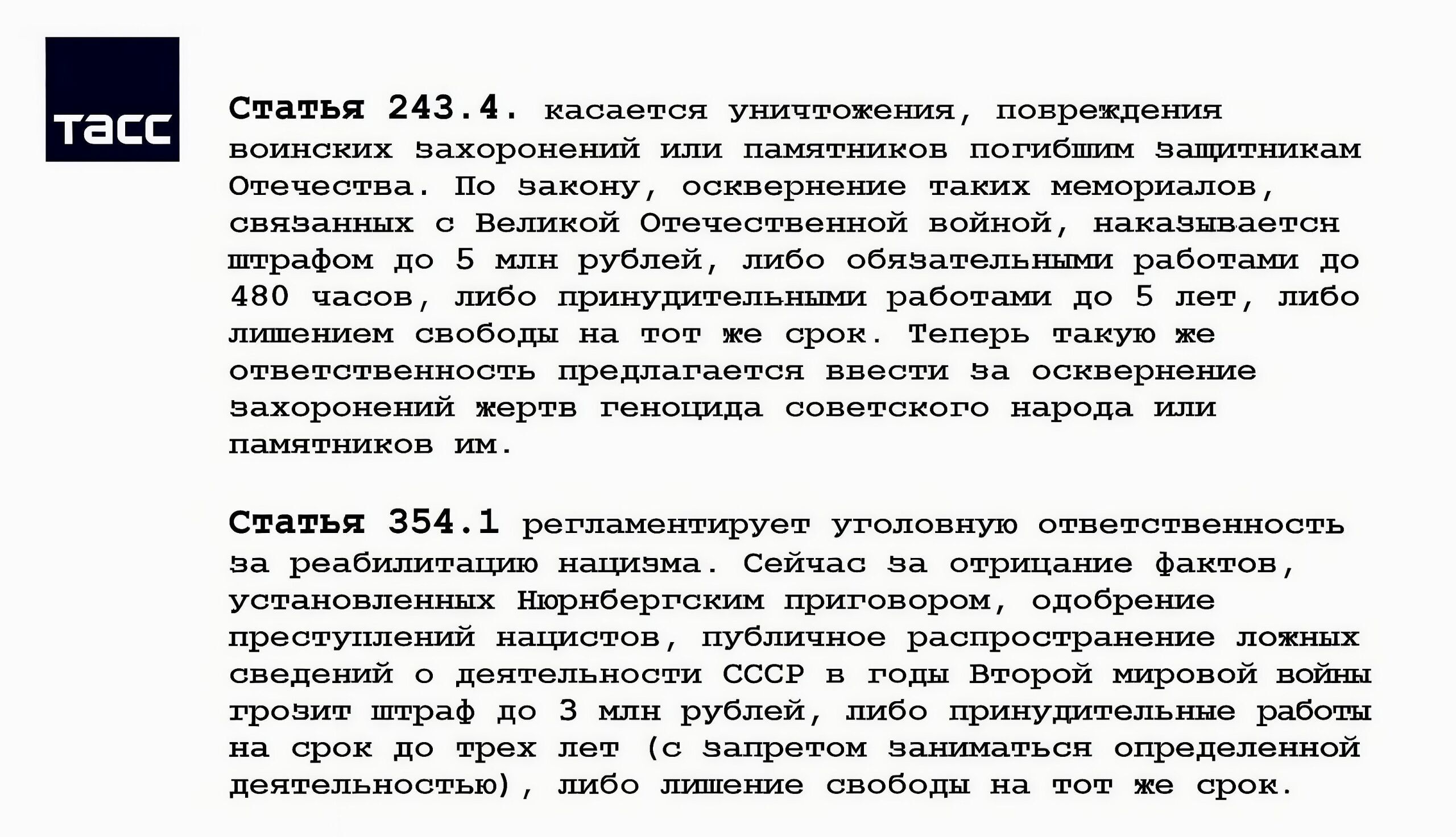 Такие же наказания предусмотрены за демонстративное осквернение символов воинской славы России, оскорбление памяти защитников Отечества и унижение чести и достоинства ветеранов ВОВ. В новом законопроекте прописано аналогичное наказание за публичное отрицание факта геноцида советского народа, и оскорбление памяти жертв геноцида.
