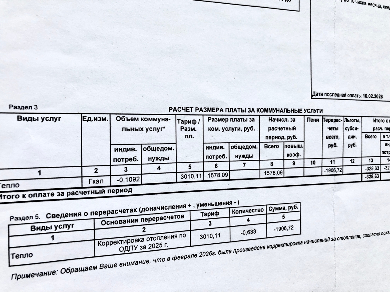 Когда пришел платежный документ за отопление за январь 2026 года, я сначала не поверил своим глазам. В нём стояла сумма к оплате 1578.09 рублей. Потом вспомнил, что зима в прошлом году у нас была очень теплая. Поэтому решил дождаться платежного документа за февраль, в котором была бы указана расшифровка начисления для годового перерасчета платы за тепло. Документ за февраль на руках. Наливаем чайку, смотрим и анализируем.