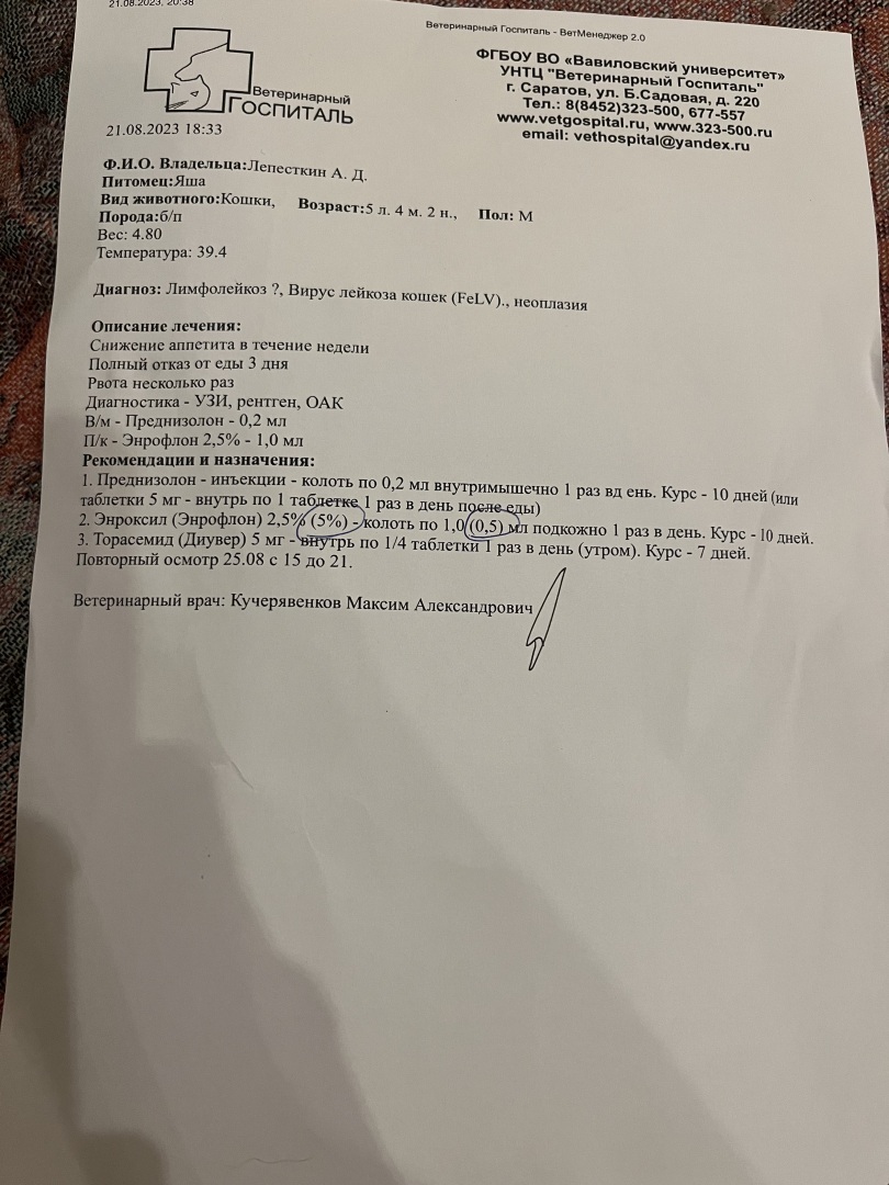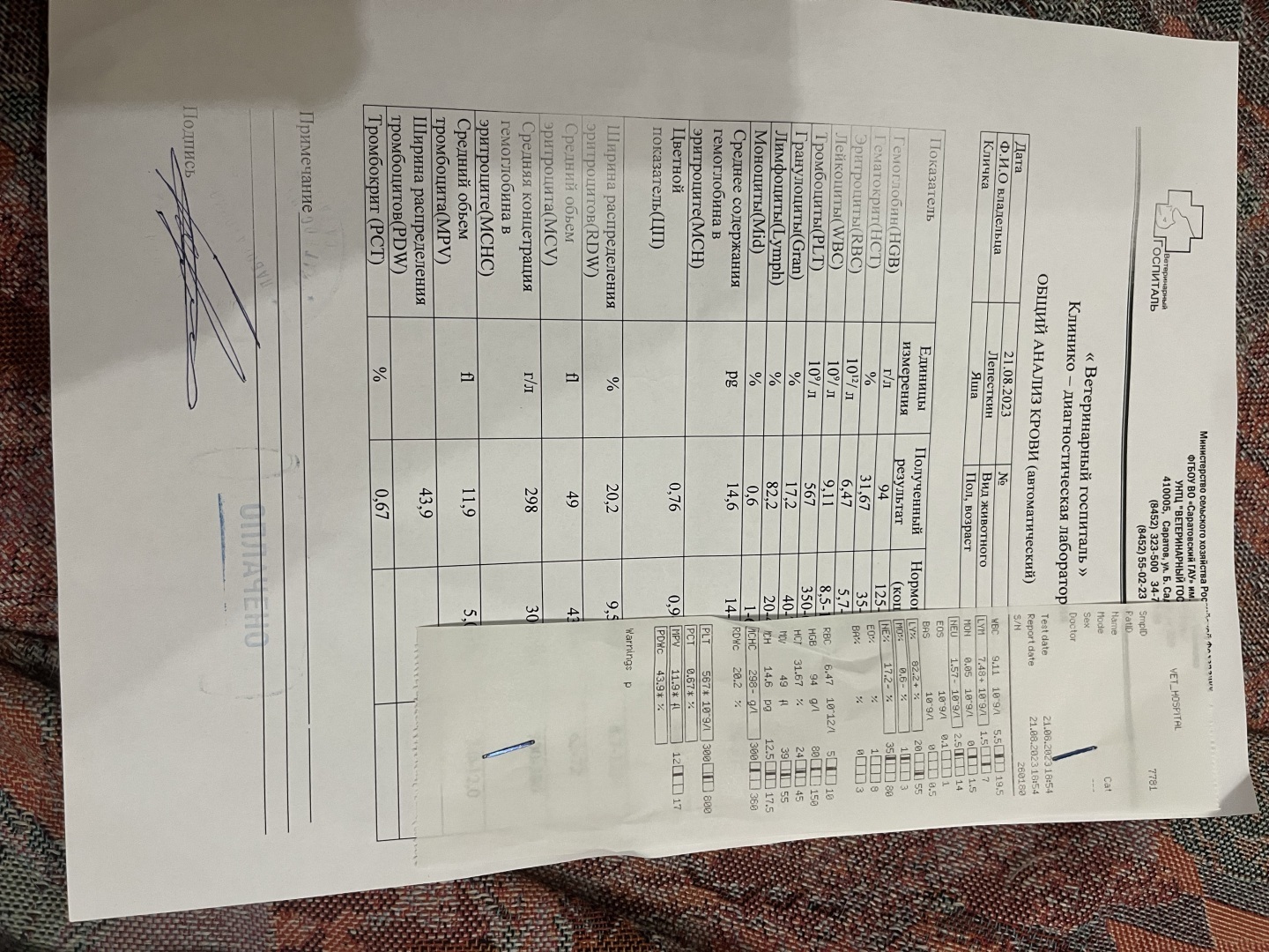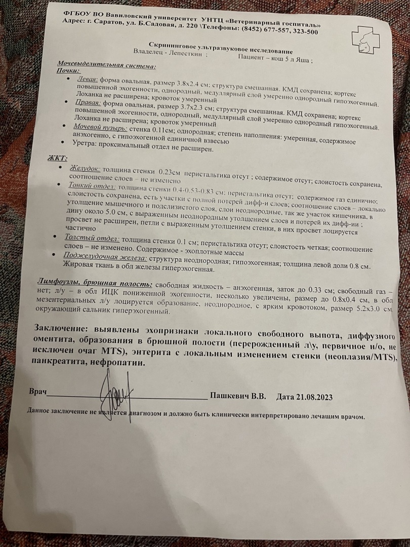 Сегодня наверно самый ужасный день в моей жизни. Мы поехали на прием ко врачу, он осмотрел кота и отправил на анализы. Температура была незначительно повышена. Сдали сначала кровь, потом пошли на рентген, врач дал неутешительный диагноз, жидкость в легких. Потом мы ждали узи часа полтора в очереди. Диагноз меня травмировал окончательно, онкология…