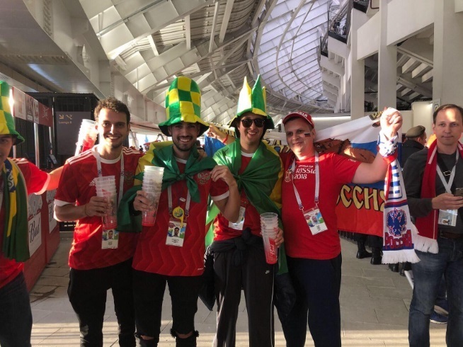 В перерыве, праздник футбола и объединение болельщиков со всего мира. Кстати, болельщики из других стран были в восторге от того, что у нас вкусное и дешевое пиво!