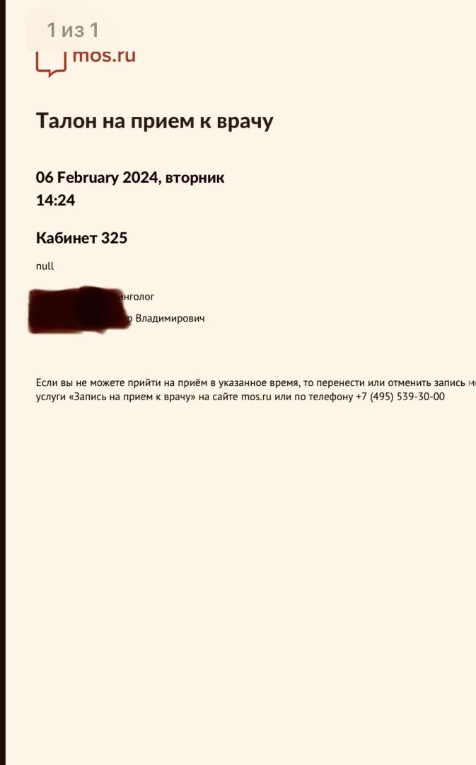 Итак, в начале этого года мне потребовалась помощь врача-отоларинголога – ЛОР. 30 января 2024 года я решила записаться к врачу через портал мос.ру, с целью приема у врача по ОМС. Для этого нужно иметь учётную запись на портале, вспомнив со второй попытки пароль я успешно вошла в систему - свой личный кабинет. Забила в поиске «запись к врачу». К сожалению, моя поликлиника закрыта на ремонт, и ближайшее ко мне здание клиники с нужным мне врачом находится очень далеко. В Москве тема такая - есть как бы главная поликлиника и ее филиалы, вот мне пришлось ехать в один из филиалов. Запись ближайшая была только через неделю – ну ок. Кликнув пару раз по экрану телефончика я записалась к врачу на 6 февраля 2024 года, вышла из системы.