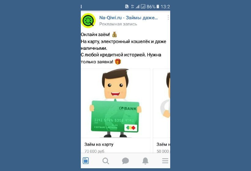 Эта реклама массово заполонила социальную сеть «Вконтакте», был создан даже «займобот». Для получения займа Вам требуется всего-навсего ввести данные своей банковской карты или номер мобильного телефона, а также свои паспортные данные. Вам предлагается выразить свое согласие с условиями получения займа, и большинство сограждан, желающих получить быстрые займы, просто ставят «галочку» в окошке согласия, даже не ознакомившись с ними.