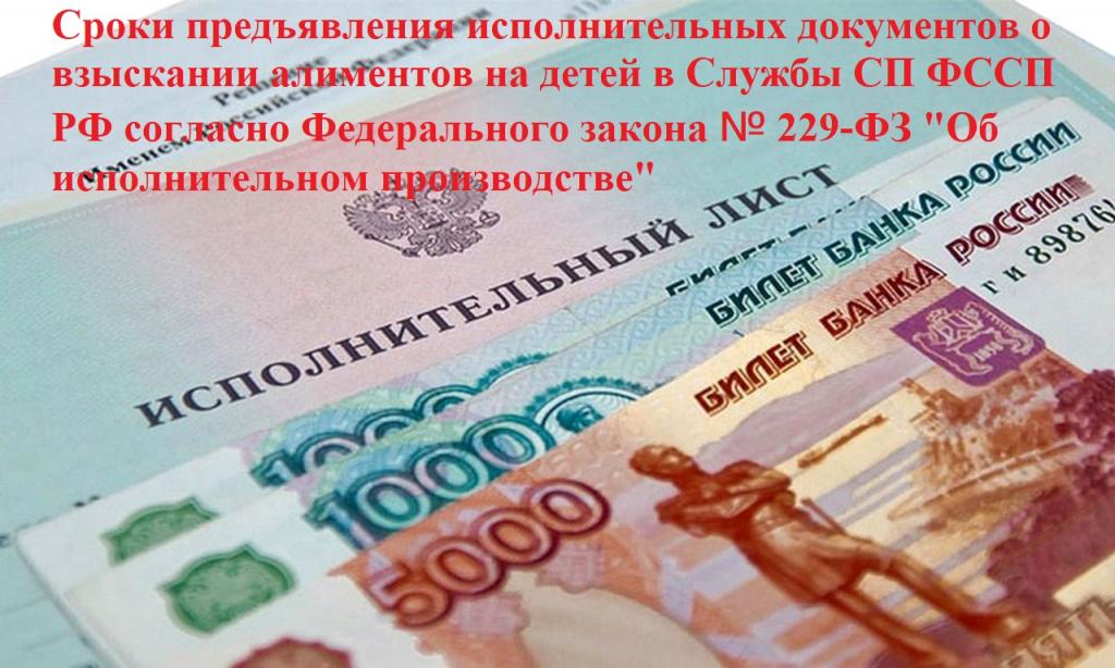 Сроки предъявления исполнительных документов (исполнительного листа, судебного приказа, соглашения о взыскании алиментов) о взыскании алиментов на несовершеннолетних детей для возбуждения исполнительного производства в подразделения Служб судебных приставов ФССП Российской Федерации регулируются Федеральным законом № 229-ФЗ «Об исполнительном производстве» (далее – ФЗ № 229-ФЗ) и Семейным кодексом Российской Федерации (далее – СК РФ).