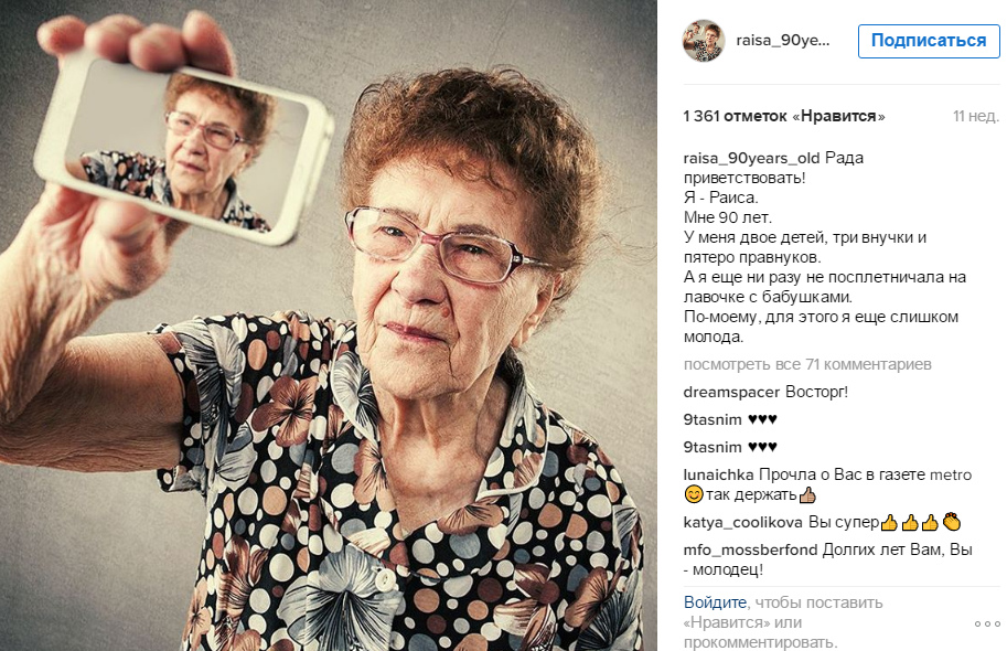 Еще одна восходящая звезда ****.com%2Fraisa_90years_old%2F">Instagram****— 90-летняя Раиса , популярность которой помогли обрести ее внучки. Сама Раиса убеждена, что секрет повышенного интереса со стороны аудитории заключается в том, что ей есть, что рассказать молодому поколению.