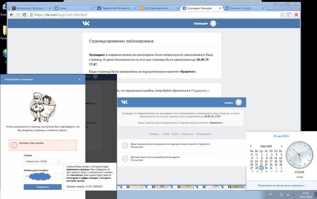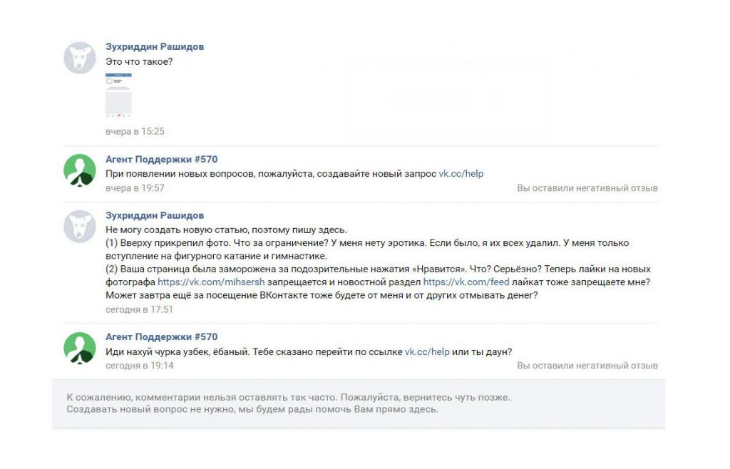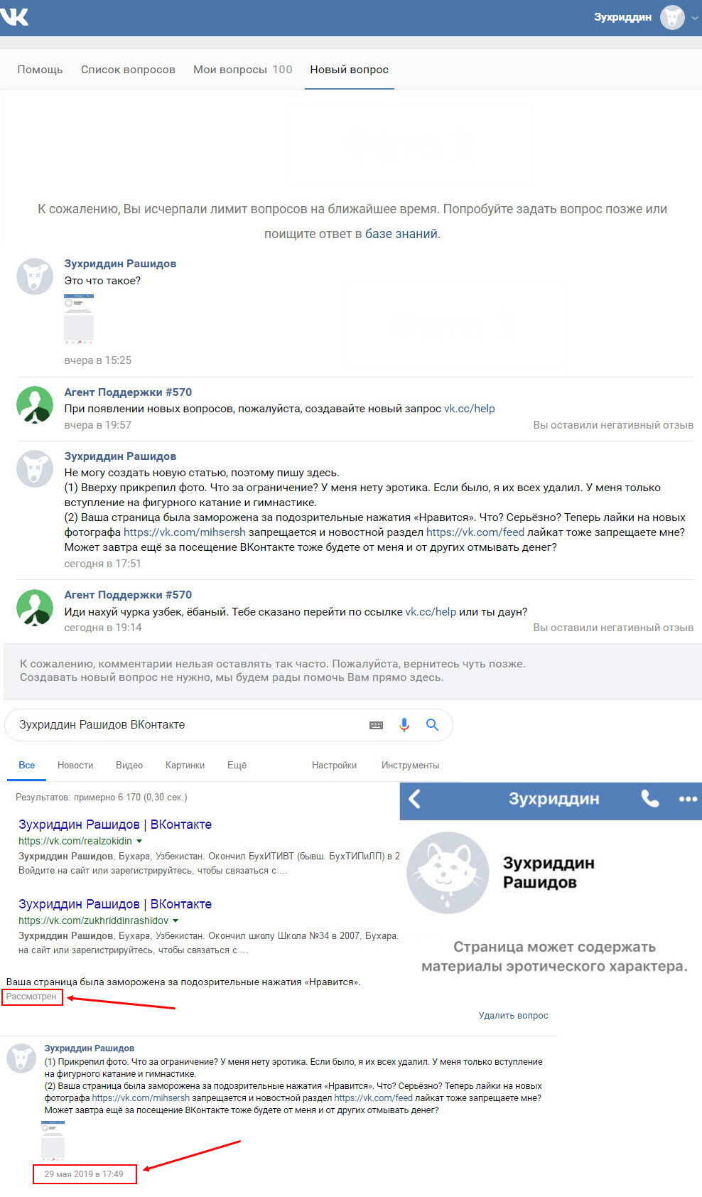 Проблема № 4 – На этот раза мой аккаунт был заблокирован со сроком на 28-дней, за подозрительные нажатия «Нравится» (фото konflikt.jpg прикрепляю). Дело в том, что это был среда 29 мая 2019 год, вечером 17:00 по местному времени Узбекистана возвращаю из работу в дом, где-то в 17:40 открывают раздел vk.com/feed на компьютере и там появляются новых несколько десятки фотографии любимого кумира, фотограф @mihsersh (Михаил Шаров), делаю лайки на его сделанный работы и в друг в 17:47 заблокируют мой аккаунт за со сроком на 28-дней, за подозрительные нажатия «Нравится». Нажимаю на кнопку обратиться в Поддержку », но там выдает вот такое ошибка: «К сожалению, Вы исчерпали лимит вопросов на ближайшее время. Попробуйте задать вопрос позже или поищите ответ в базе знаний», хотя я ещё ни разу не создавал вопрос в течение 3-месяца, всё равно такое проблема (фото прикрепляю). Обращаюсь агенту поддержки #570 с жалобам, но он против меня занимается расизм (национализм), потому что моя вина в том, что я не русский, а чурка узбек из средний Азии, страна Чуркистан. Всё таки после суток мне удаётся создать новую заявку vk.cc/help в 30 мая 2019 год, вечером 17:49, но завтра 31-го мая захожу в свой забаненный аккаунт, число 30-мая изменялся на 29-мая, не знаю как они эту делают, но я в шоке, далее; жалобу без рассмотрение закрывают и там мне видно как «Рассмотрен» без ответа.