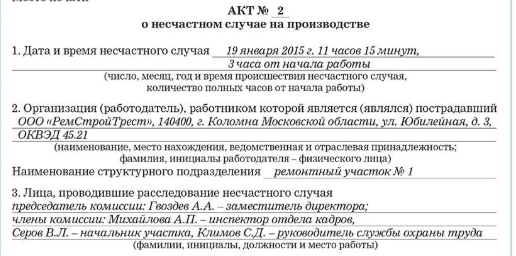 2. Здесь пишутся подробности о предприятии: полное название, адрес (фактический, почтовый и юридический), данные из обосновывающих документов (ОКВЭД, ОКОНХ и т. п.), фамилия, имя, отчество представителя и название отдела или структурного подразделения, в котором трудится пострадавший. В разделе следует придерживаться регистрационных документов, поскольку акт является важным документом, когда выплачивают страховки.