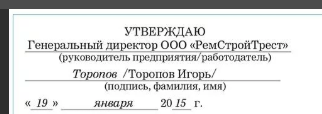 «Шапка» документа включает в себя табличку, где утверждается акт руководителем предприятия. Здесь вписывают название организации (в соответствии с основными документами), специализацию руководителя (директор или генеральный директор), фамилию, имя и отчество, а также дату утверждения. Подпись руководителя ставится, когда человек полностью заполнил документ.