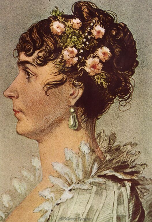 Вместо драгоценных камней, вместо ярких, бросающихся в глаза цветов, всё убранство её заключалось лишь в надетой на голову гирлянде из фиалок, да несколько букетиков этих же цветов, приколотых к груди. Очарованный, обворожённый ею генерал Бонапарт весь вечер не отходил от неё, и когда она уезжала, проводил её до кареты. Прощаясь с ним Жозефина наклонилась, и букет фиалок с груди, как бы случайно упал к её ногам. Наполеон схватил его, страстно прижал к губам и унёс с собой, как первый залог любви.