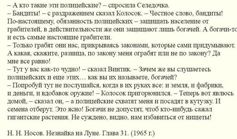 В то время у нас была милиция и не было явного расслоения на богатых и бедных. Поэтому полицейских и богатых можно было ругать. Но времена изменились. Где-то наверняка уже пишутся новые сказки, в которых плохие бедные строят козни, чтоб отобрать всё нажитое непосильным трудом у хороших богатых.