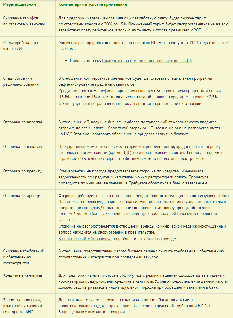 Льготы для предпринимателей, введённые Правительством из-за коронавируса