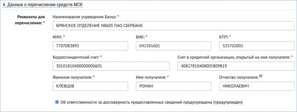 Далее нужно заполнить банковские реквизиты, на которые будут перечислять деньги. Их можно посмотреть в интернет-банке или в мобильном приложении банка, картой которого вы пользуетесь. Важно заполнить все поля, как это показано на рисунке ниже.