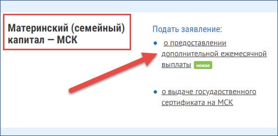2) Далее прокрутите страницу вниз до раздела «Материнский капитал» и нажмите в графе «Подать заявление» на надпись «О предоставлении дополнительной ежемесячной выплаты» (как это показано ниже на скриншоте).
