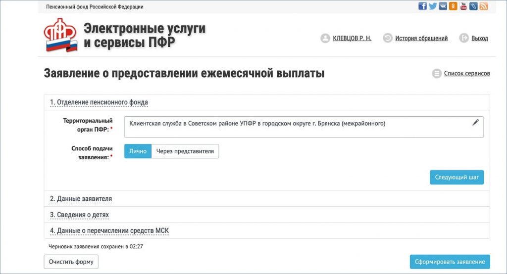 3)Откроется форма заявления, в ней выбирайте территориальный орган ПФР и способ подачи заявления — лично или через представителя.