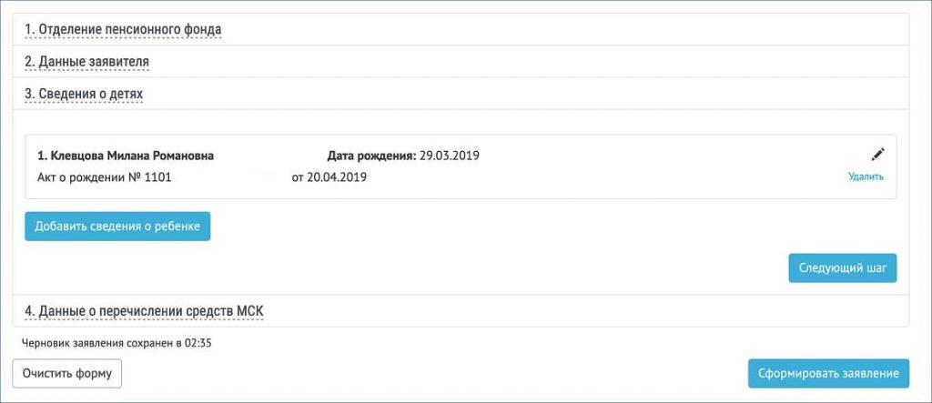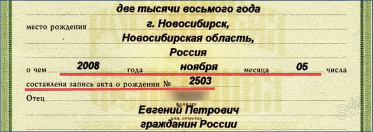 5) На следующем шаге укажите данные о ребенке (детях): Ф. И. О., дату рождения, номер и дату акта о рождении. Обратите внимание, что нужно указать не номер свидетельства, а именно номер акта о рождении! На скриншоте показано, где он находится в свидетельстве о рождении.
