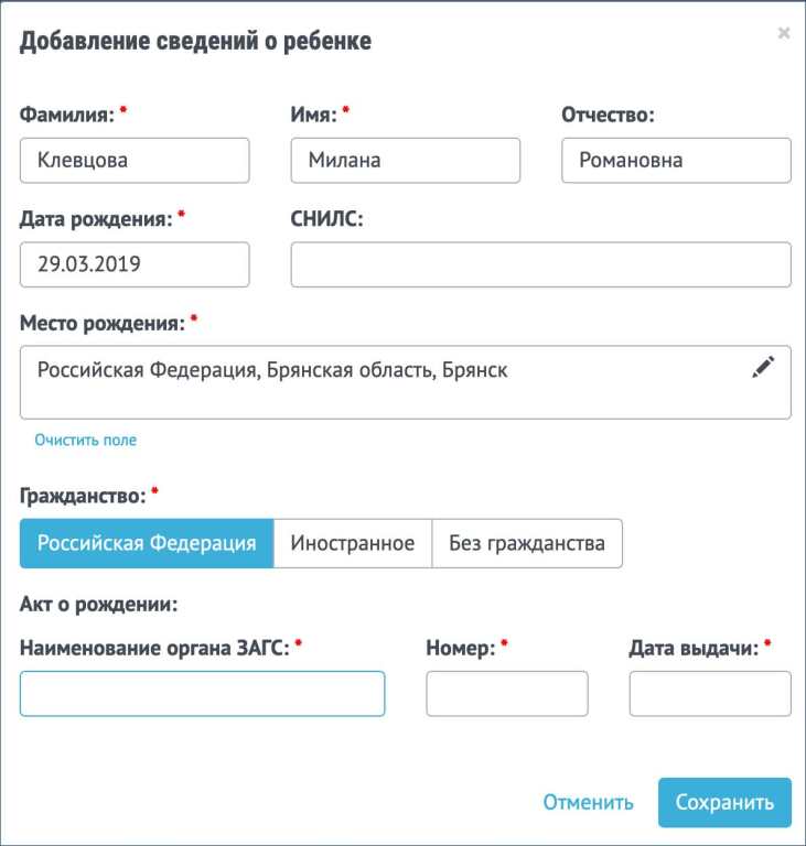6)В заявлении это будет выглядеть, как показано ниже. Номер СНИЛС ребенка заполняется, если есть.