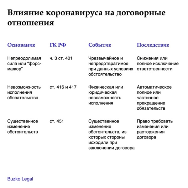 В таких ситуациях стороны хотят знать, что предусматривает договор на случай наступления таких обстоятельств. С точки зрения российского права есть три юридические концепции, которые могут применяться к договорным отношениям в ситуации кризиса:
