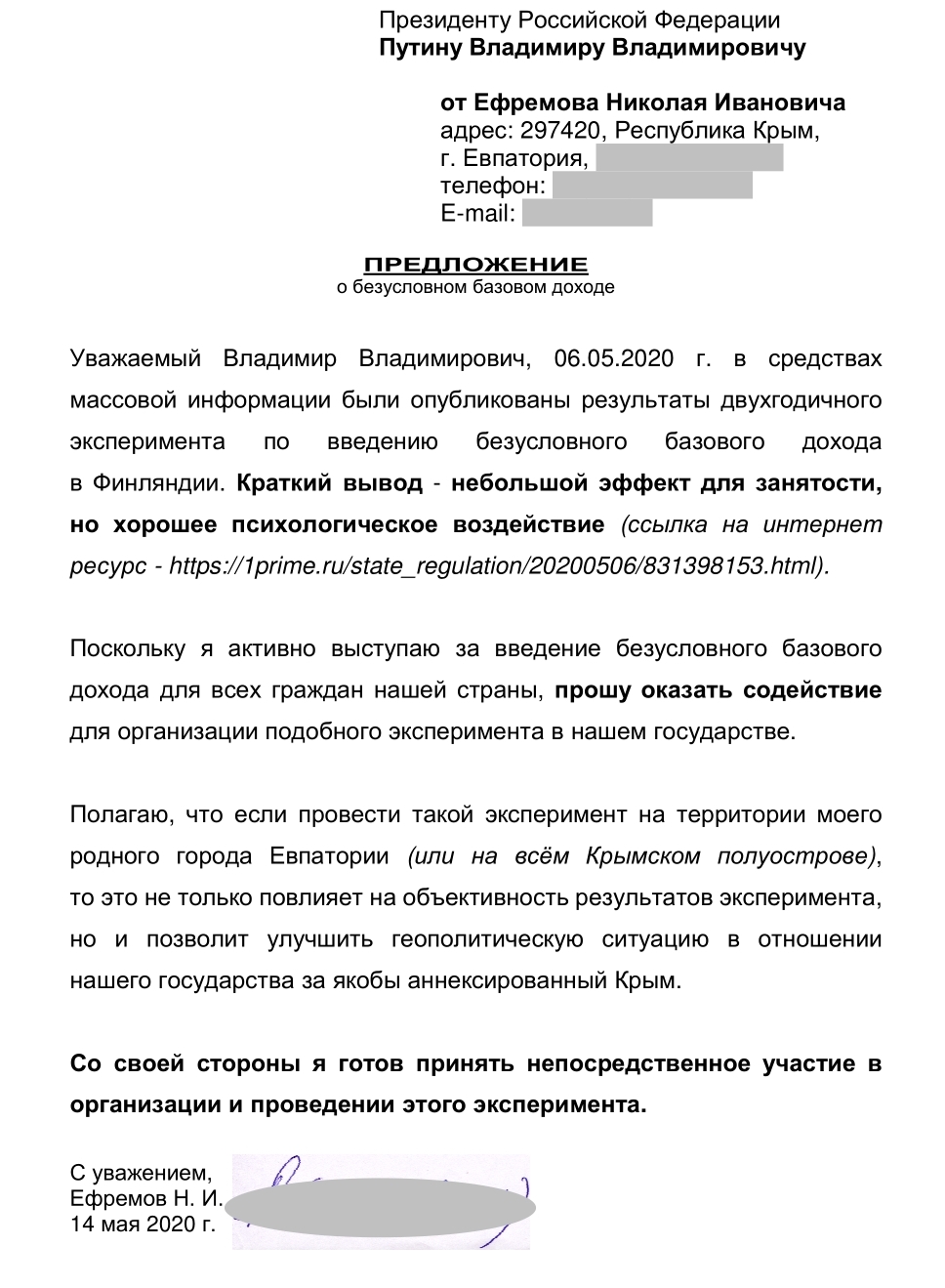 я предлагаю ввести в нашей стране ежемесячный безусловный базовый доход для всех граждан за счет разумного отчисления от добытых и реализованных природных ресурсов, добытых в нашей стране (а не ограничиваться "коронавирусными подачками" для разных слоёв населения).
