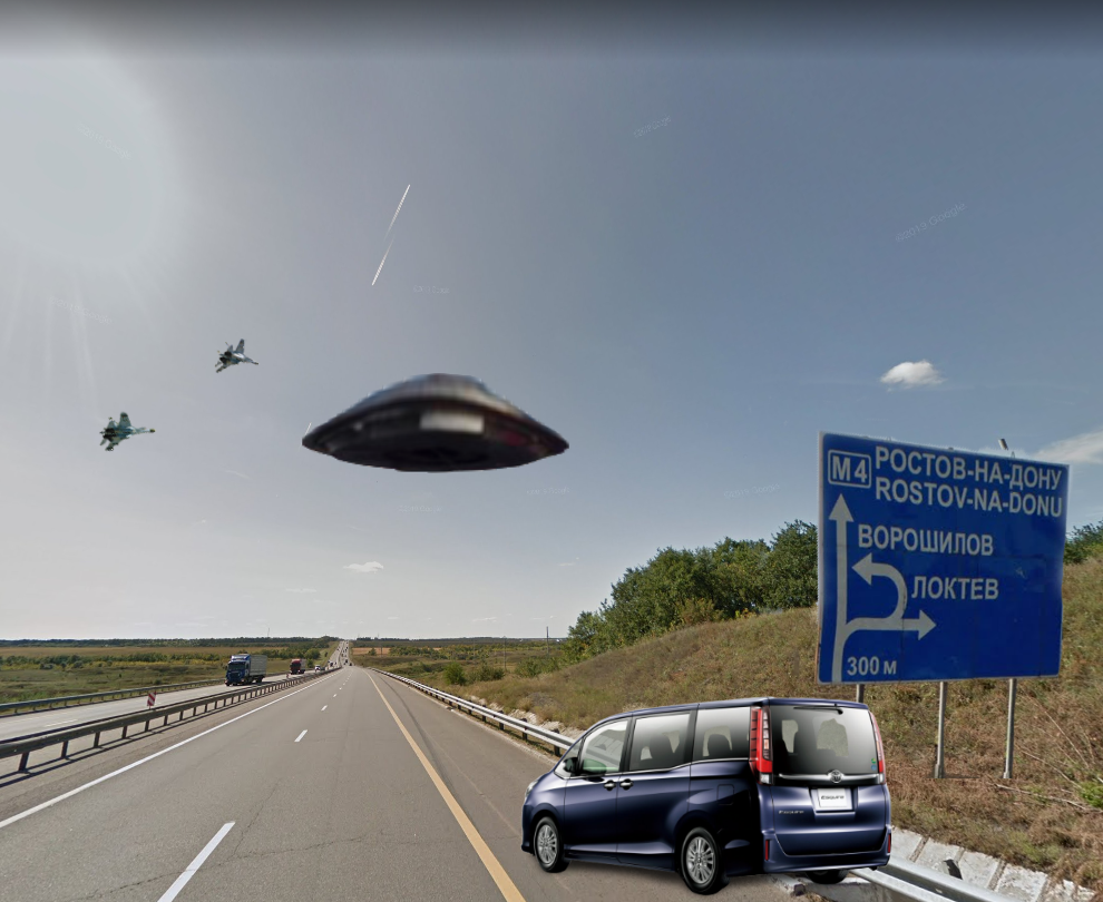Было это дело году эдак в 2004. Это была моя вторая командировка в в Южный федеральный округ (ЮФО). Время был примерно август, часов 6 вечера. Машина была японской фирмы "Тойота" микроавтобус. Нас было 5 человек и одни Володи. Нас различали по номерам - я был Владимир №2. Дорога М-4 (Дон), по которой мы ехали в районе г. Миллерово Ростовской области уходит вниз. И тут мы увидели... Летающая терелка или что то похожее на нее перелетало дорогу. Абсолютно беззвучно. Обычно на рисунках тарелки блестящие, а эта была как будто с Вторчемета - вся ржавая. Снизу 6 лап как у божьей коровки, подогнуты уголком. Вот значит она пролетела и тут же за ней несколько истребителей погнались на довольно большой скорости. Все улетели. У нас был шок. Машину остановили, мы все выскочили, сфоткать не успели, да и сотики тогда не у всех еще были. Потом мы проверили - рядом была только в/ч 33027, 474-й автомобильный батальон, 385000, Ростовская обл., г. Миллерово.