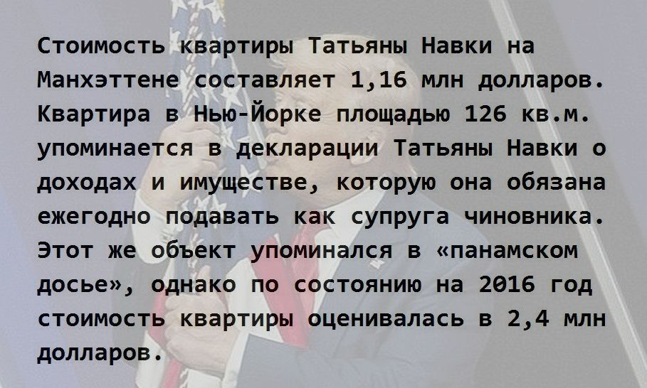 Заместитель гендиректора Transparency International (Россия) Илья Шуманов опубликовал в Twitter пост, из которого следует, что фигуристка и супруга пресс-секретаря президента Дмитрия Пескова Татьяна Навка погасила ипотечный кредит за свою квартиру в Нью-Йорке.