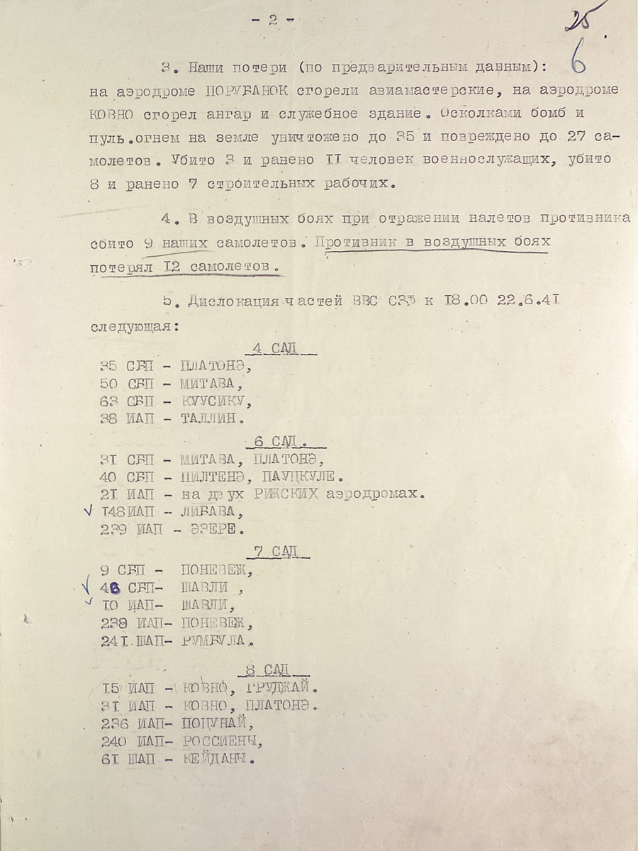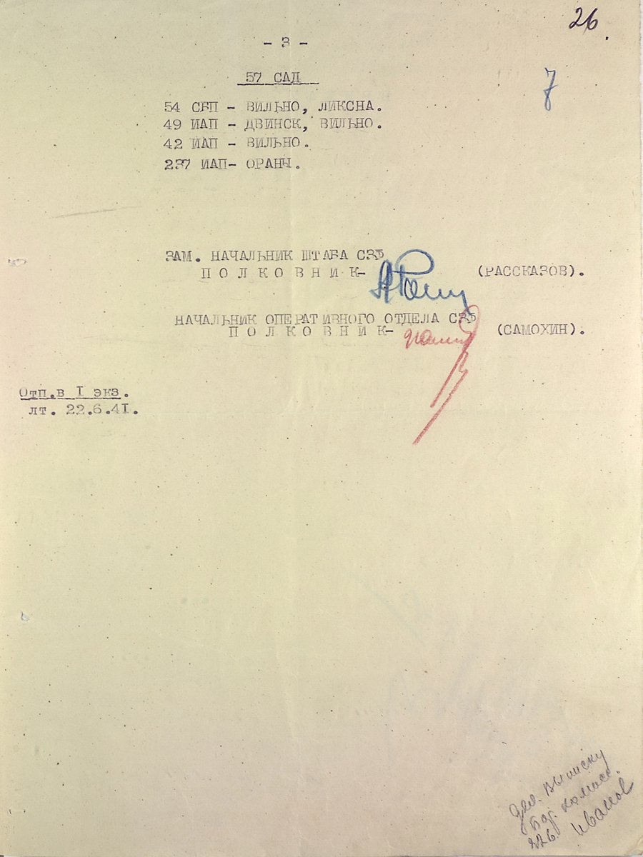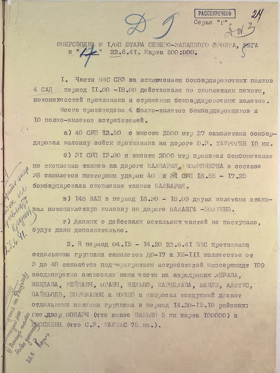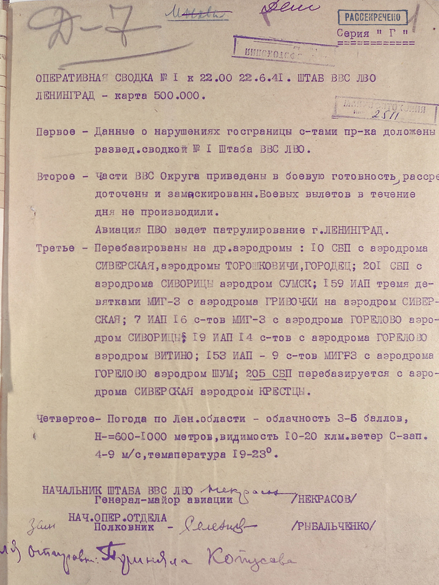 Оперативная сводка №1 к 22.00 22.06.1941 от начальника штаба ВВС ЛВО Некрасова и начальника оперативного отдела Рыбальченко