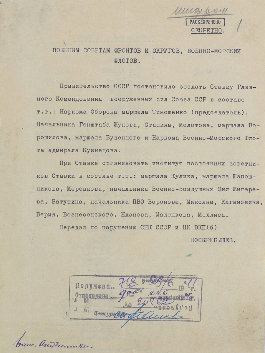 Телеграмма о создании Ставки Главного Командования ВС СССР от 23.06.1941 г.