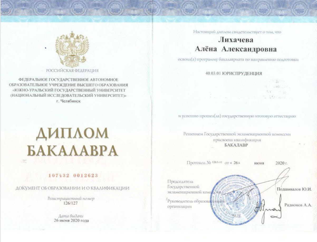 Высшее•Южно-Уральский государственный университет•Юриспруденция•Челябинск•год окончания: 2020
