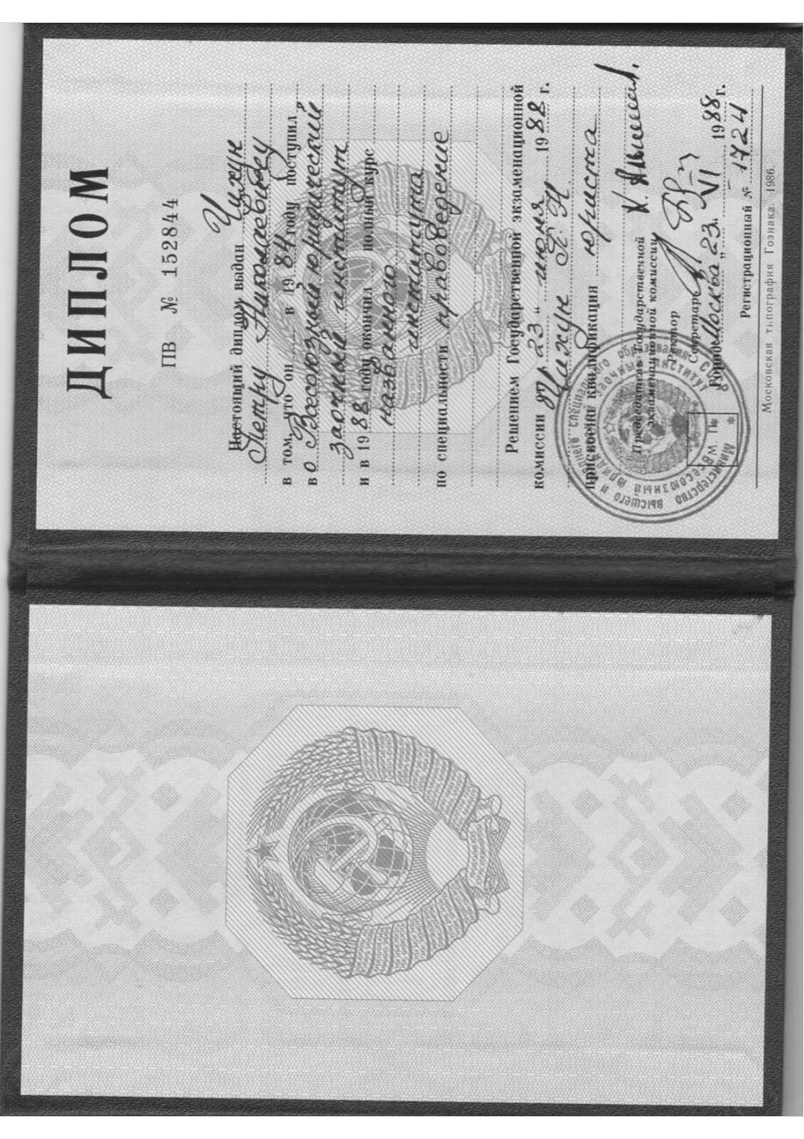 Высшее•Всесоюзный юридический заочный институт•Юридический•Москва•год окончания: 1988