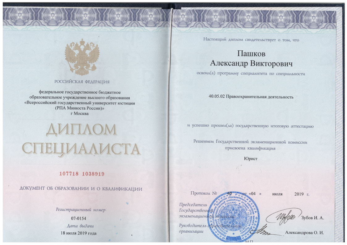 Высшее•Всероссийский государственный университет юстиции (РПА Минюста России)•Юриспруденция•Москва•год окончания: 2019