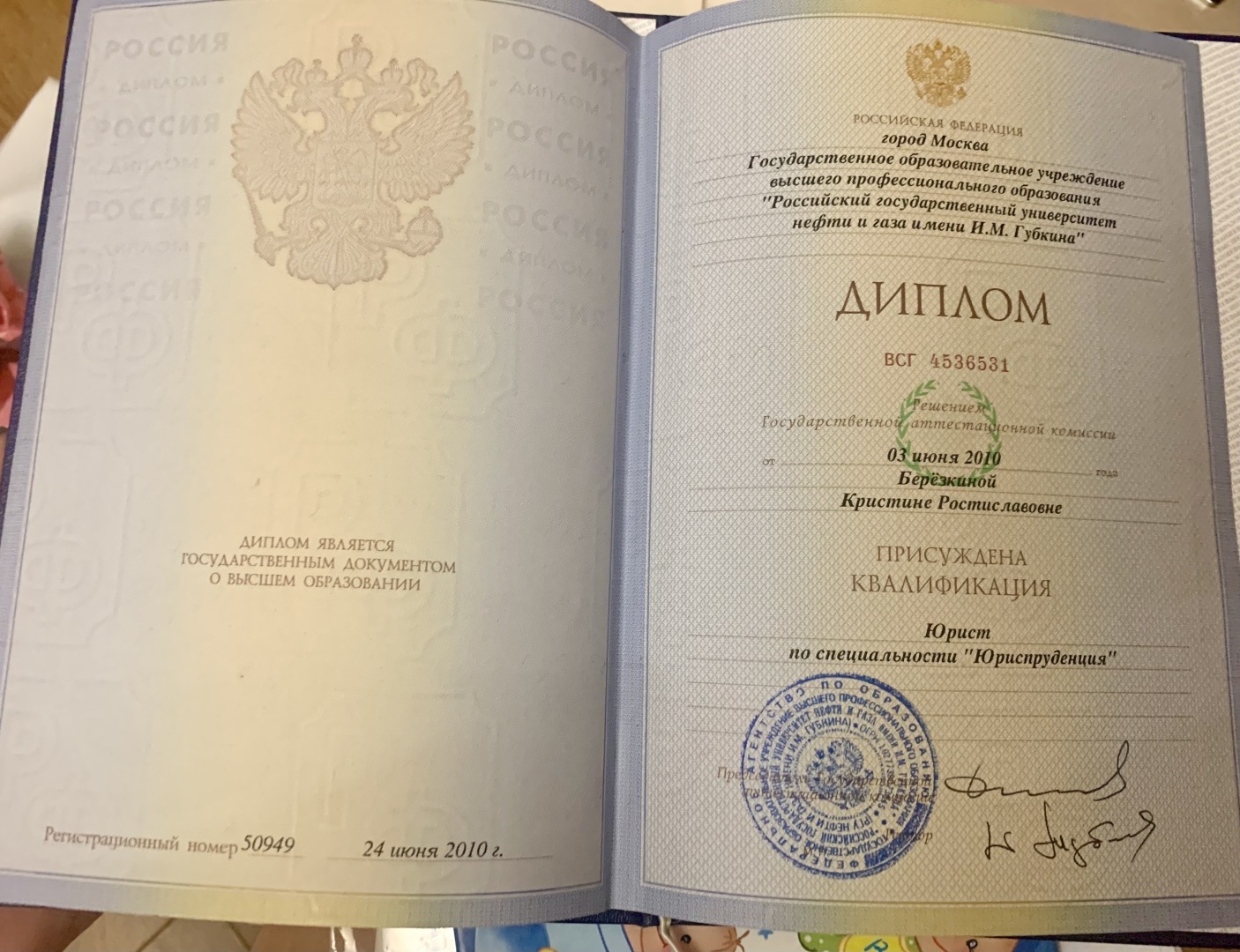 Высшее•Российский государственный университет нефти и газа имени И.М. Губкина•Юриспруденция•Москва•год окончания: 2010