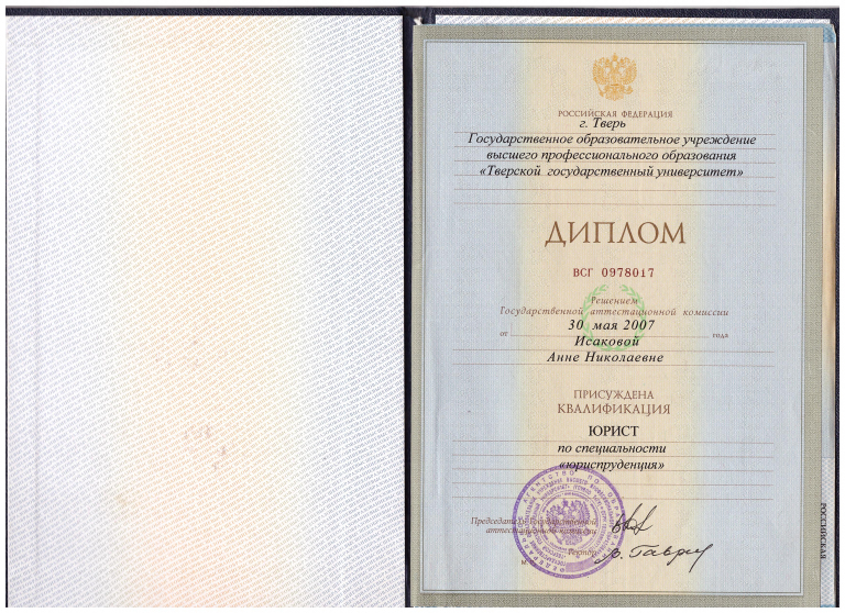 Высшее•Тверской государственный университет•Юридический (юрист)•Тверь•год окончания: 2007