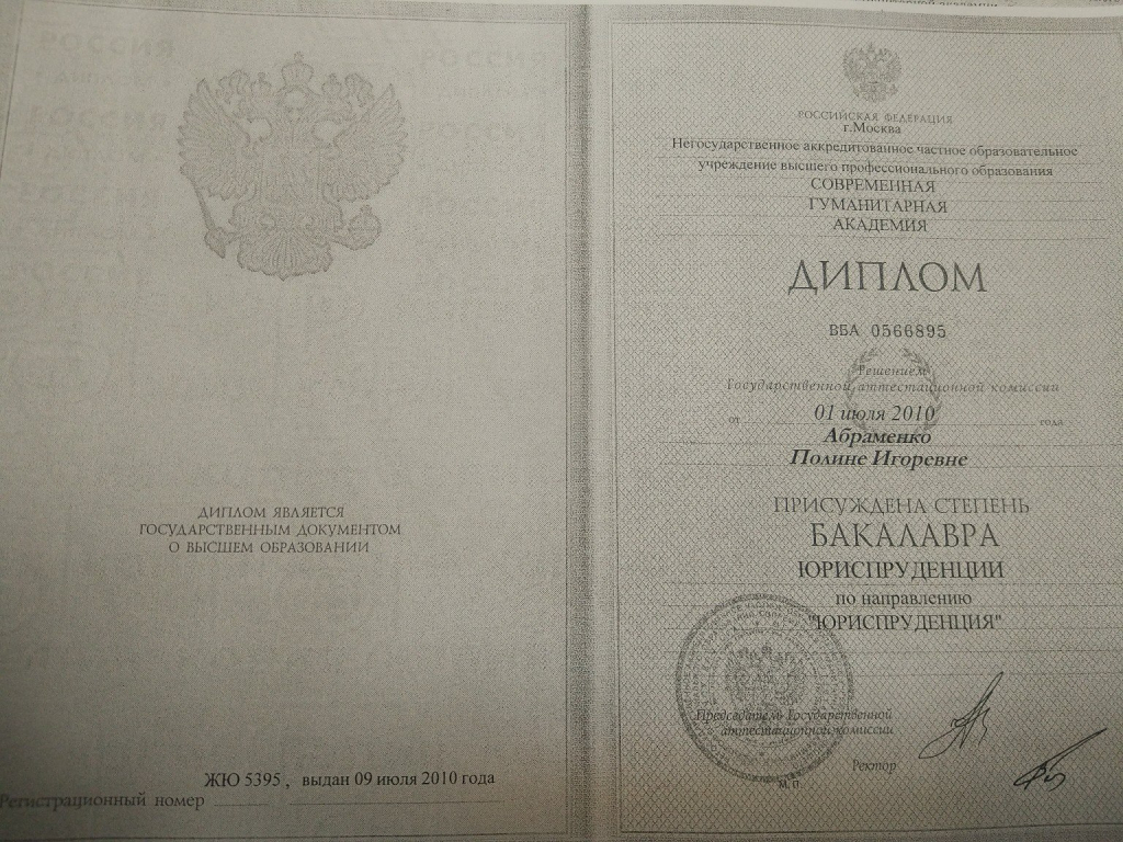 Высшее•Рыбинский филиал Современной гуманитарной академии•Юриспруденция (Бакалавр юриспруденции)•Рыбинск•год окончания: 2010