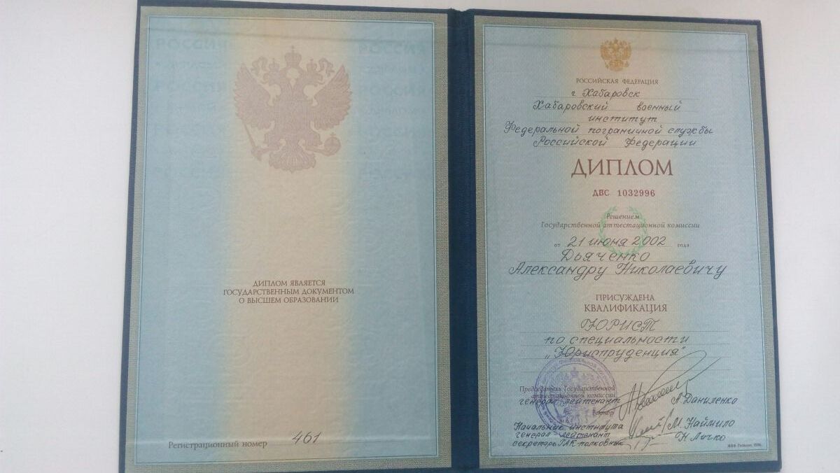 Высшее•Хабаровский пограничный институт Федеральной службы безопасности Российской Федерации•Юриспруденция (Юрист)•Хабаровск•год окончания: 2002