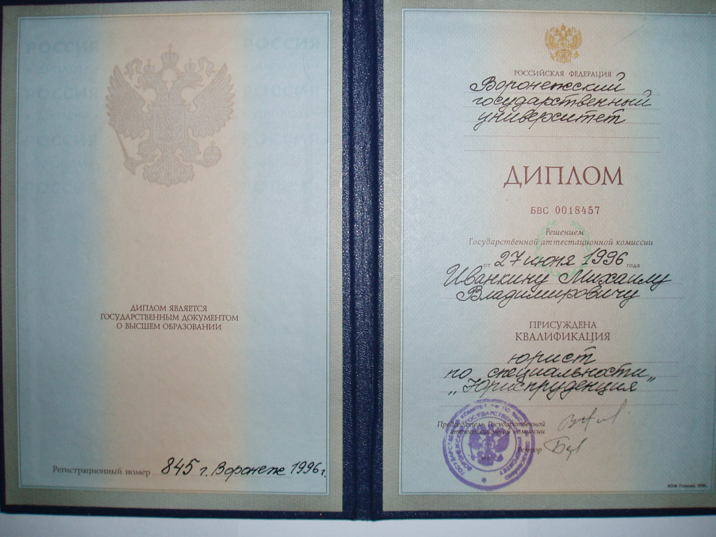 Высшее•Воронежский государственный университет•Юридический•Воронеж•год окончания: 1996