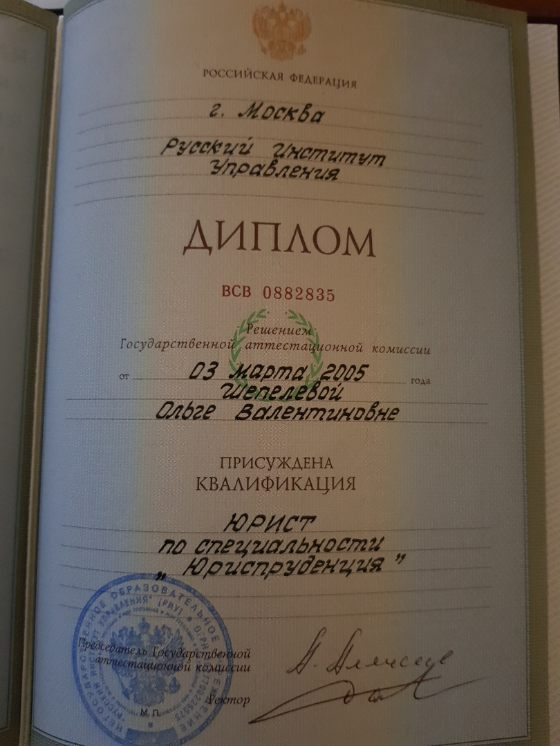 Высшее•Русский институт управления имени В.П. Чернова•Юриспруденция (Юрист)•Москва•год окончания: 2013