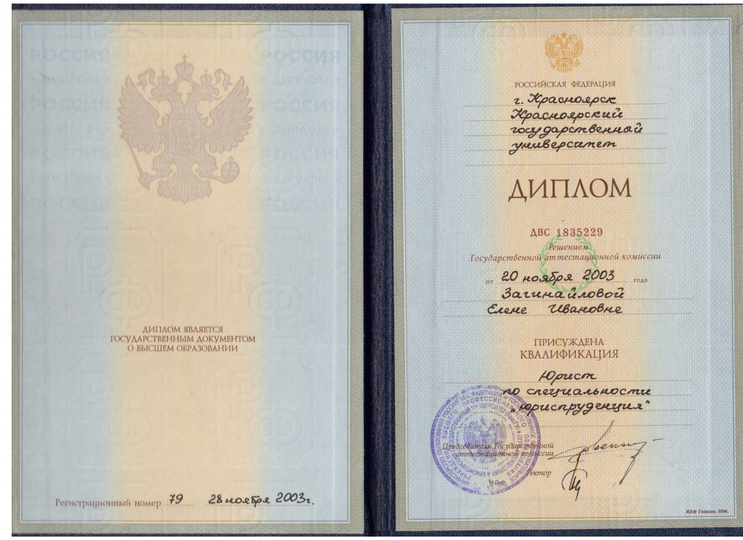 Высшее•Красноярский Государственный Университет•Юриспруденция (юрист)•Красноярск•год окончания: 2003