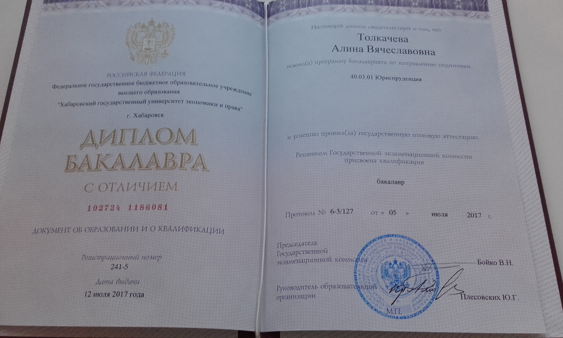 Высшее•Филиал Санкт-Петербургского института внешнеэкономических связей, экономики и права в г. Хабаровске•Юриспруденция (Юрист)•Хабаровск•год окончания: 2017