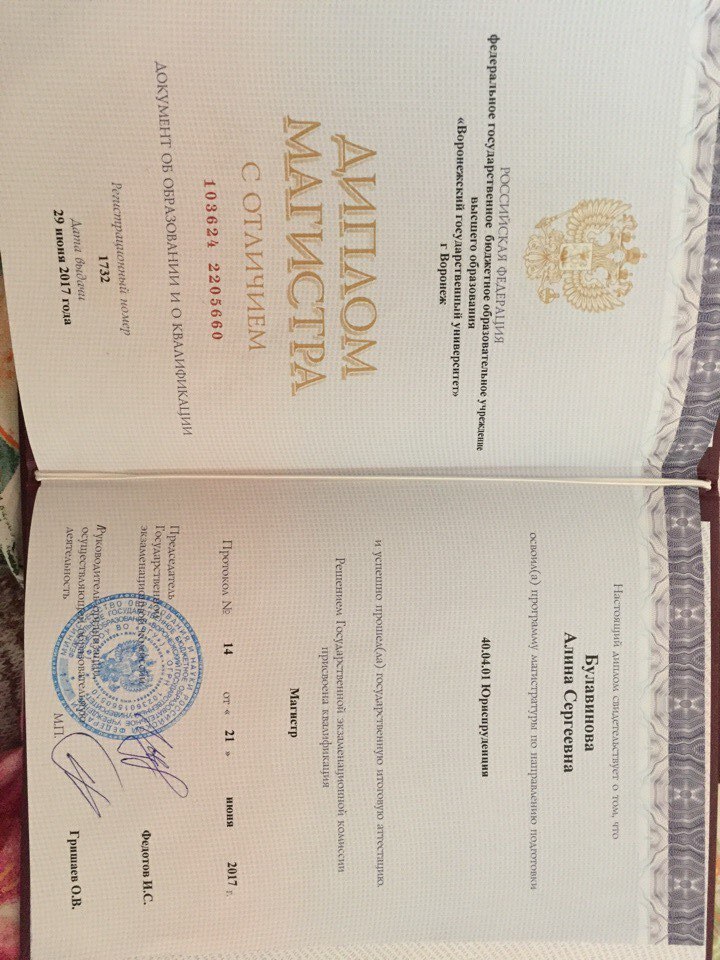Высшее•Воронежский государственный университет•Юриспруденция•Воронеж•год окончания: 2015