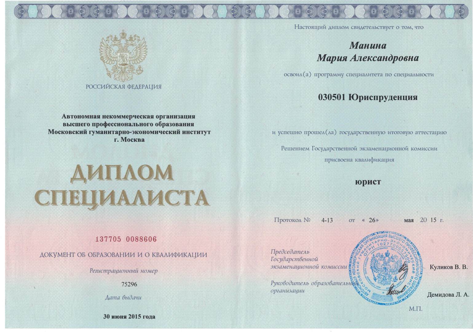 Высшее•Московский гуманитарно-экономический институт•Юриспруденция (Юрист)•Москва•год окончания: 2015