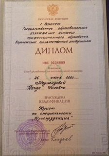 Высшее•Воронежский государственный университет•Юриспруденция (Юрист)•Воронеж•год окончания: 2003
