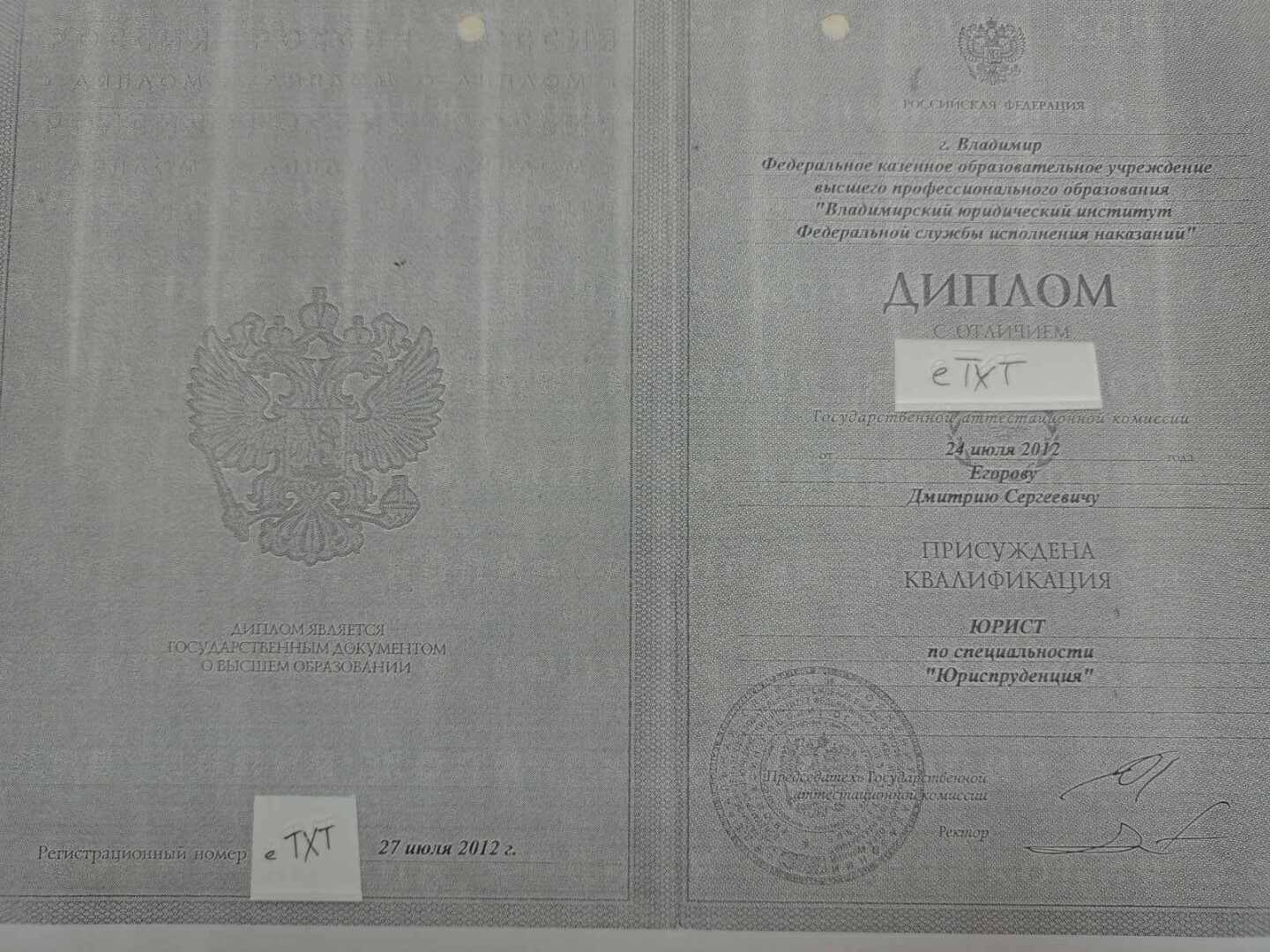 Высшее•Владимирский юридический институт Федеральной службы исполнения наказаний•Юриспруденция (Юрист)•Владимир•год окончания: 2012