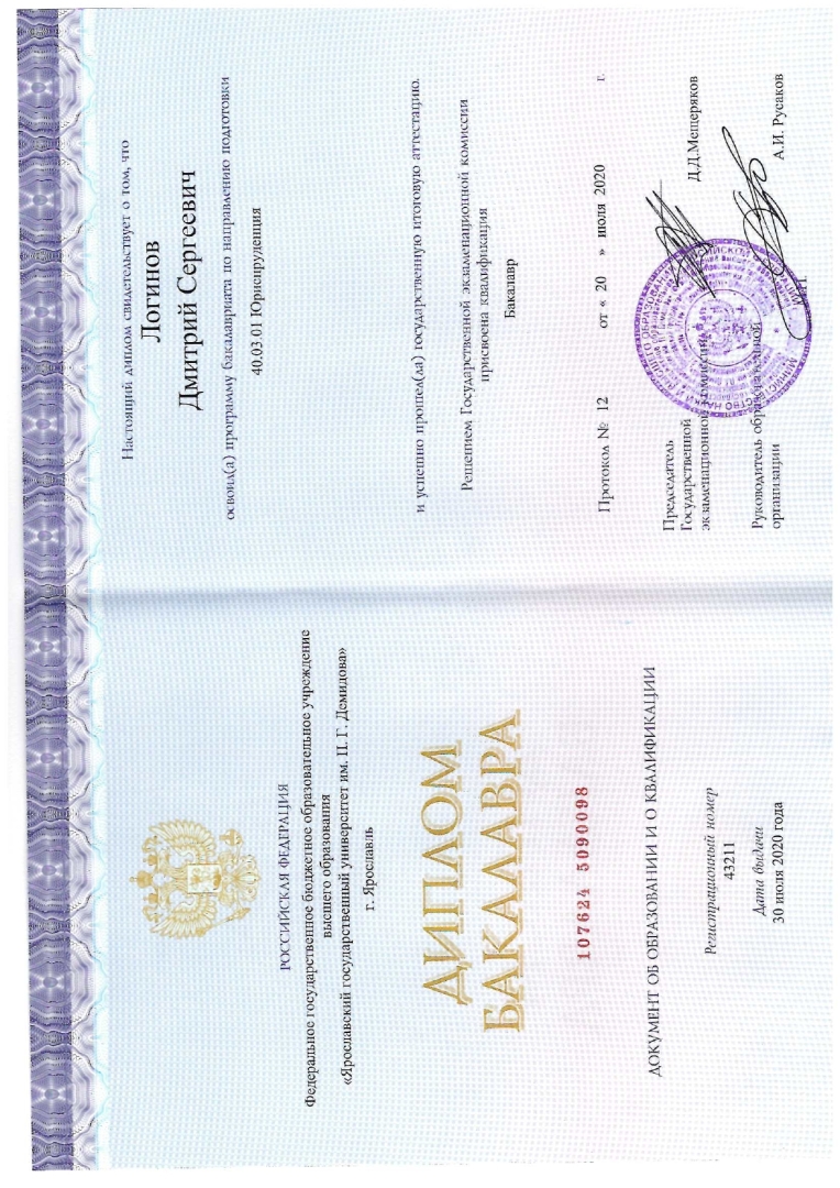 Высшее•Ярославский государственный университет им. П.Г. Демидова•Юриспруденция•Ярославль•год окончания: 2020