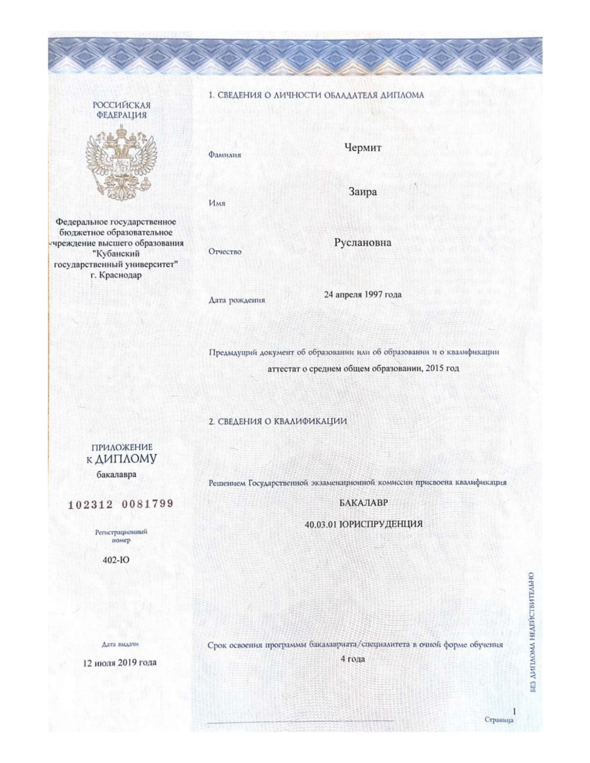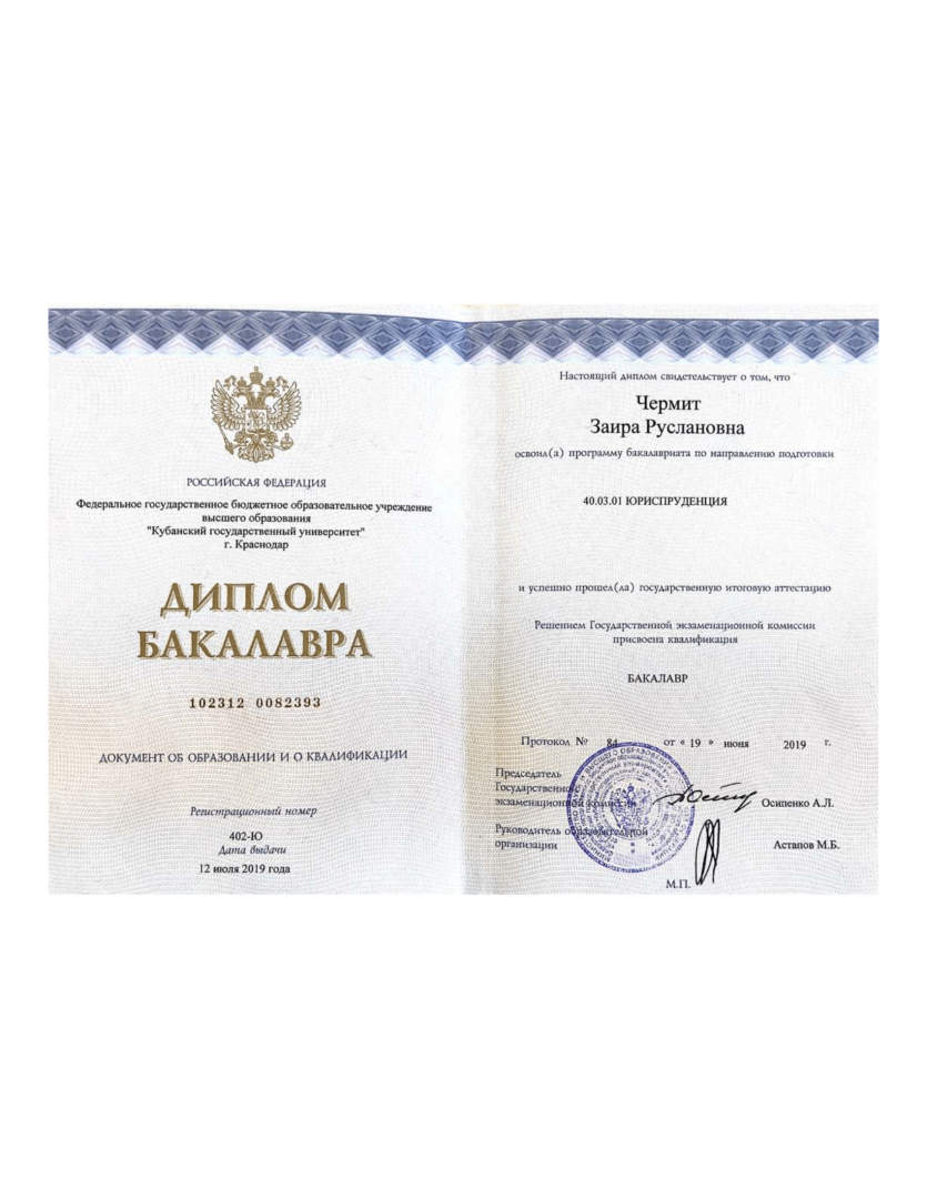 Высшее•Кубанский государственный университет•Юриспруденция•Краснодар•год окончания: 2019