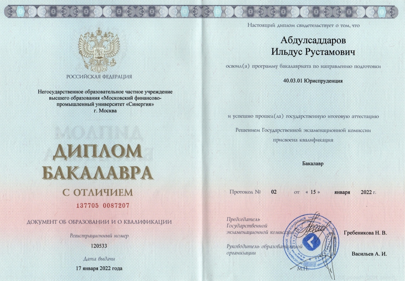 Высшее•Московский финансово-промышленный университет "Синергия»•Юридический•Москва•год окончания: 2022