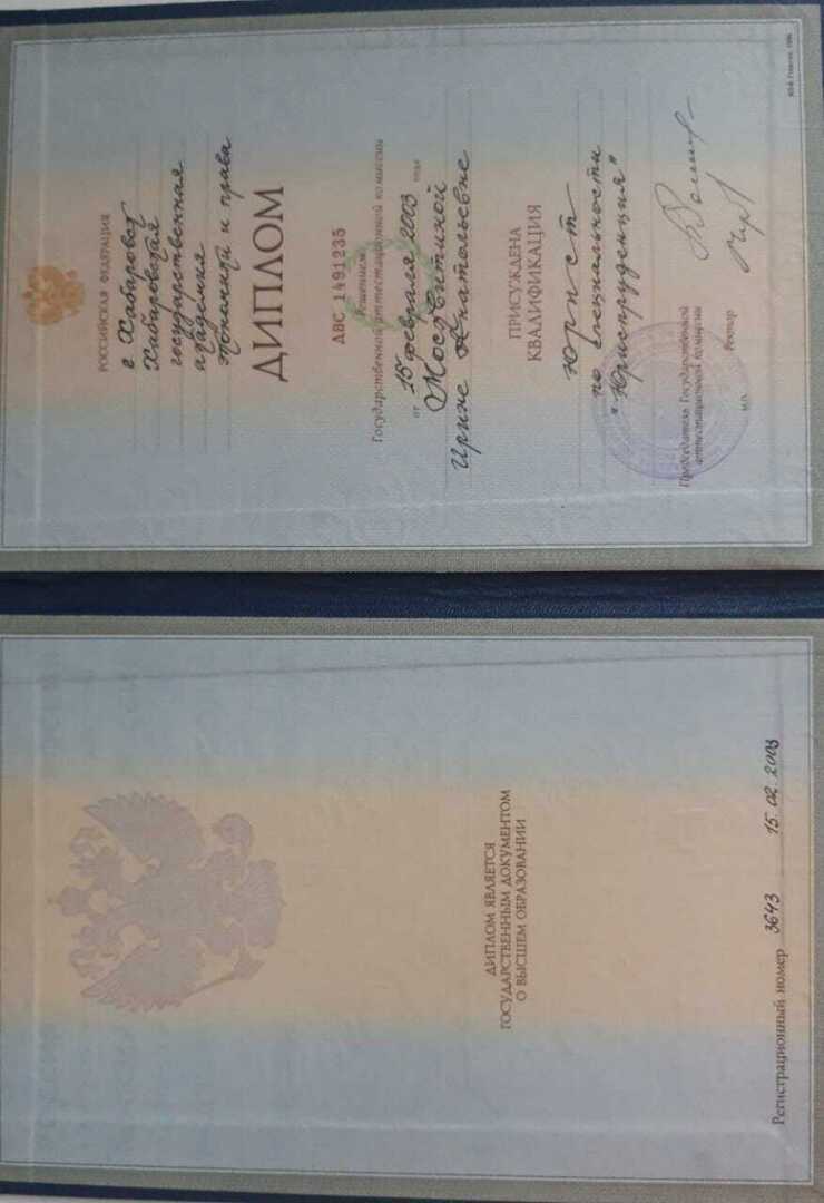 Высшее•Хабаровская государственная академия экономики и права•Юриспруденция•Хабаровск•год окончания: 2003