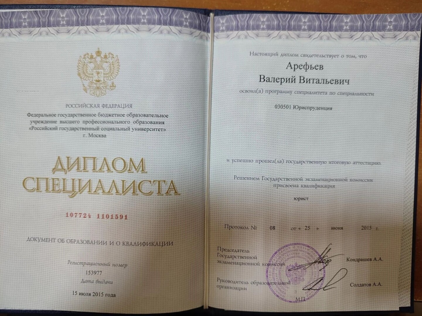 Высшее•Российский государственный социальный университет•Юриспруденция•Москва•год окончания: 2015