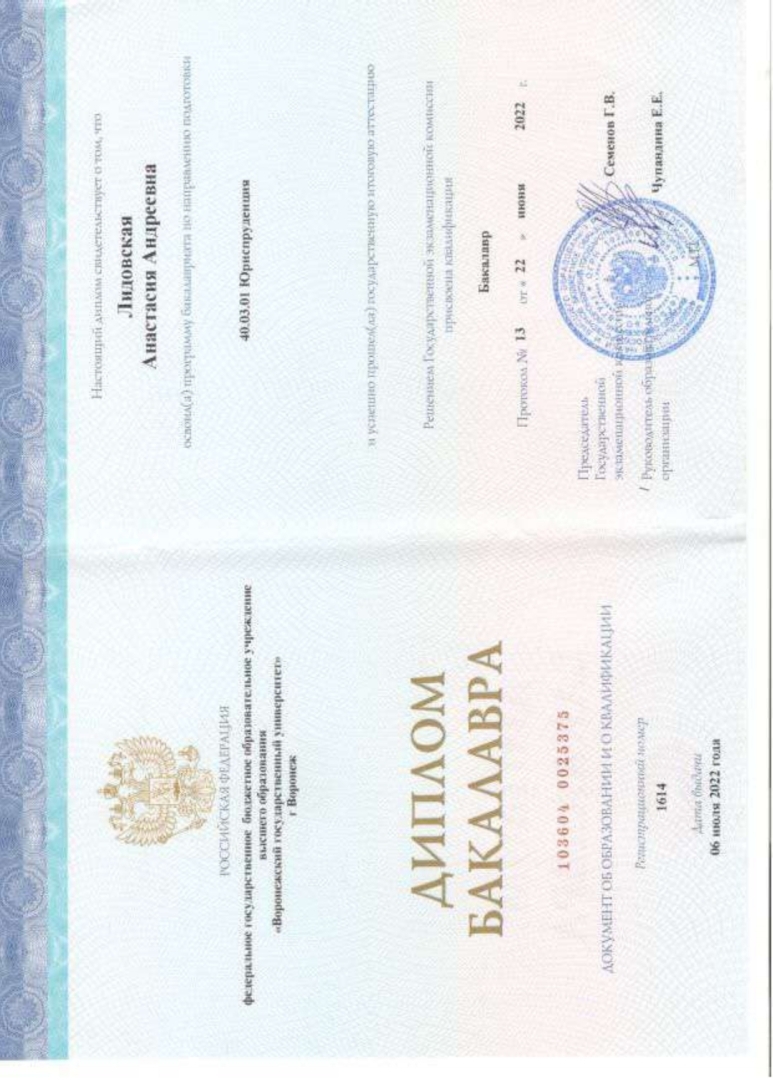 Высшее•Воронежский государственный университет•Юридический•Воронеж•год окончания: 2022